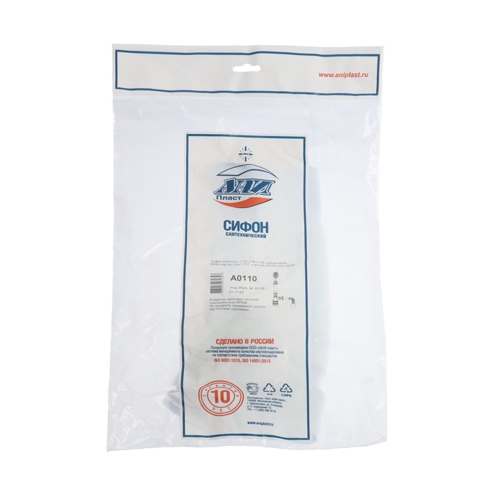 Сифон сливной АНИ пласт A0110 для кухонных моек с диаметром сливного отверстия 50-60 мм.